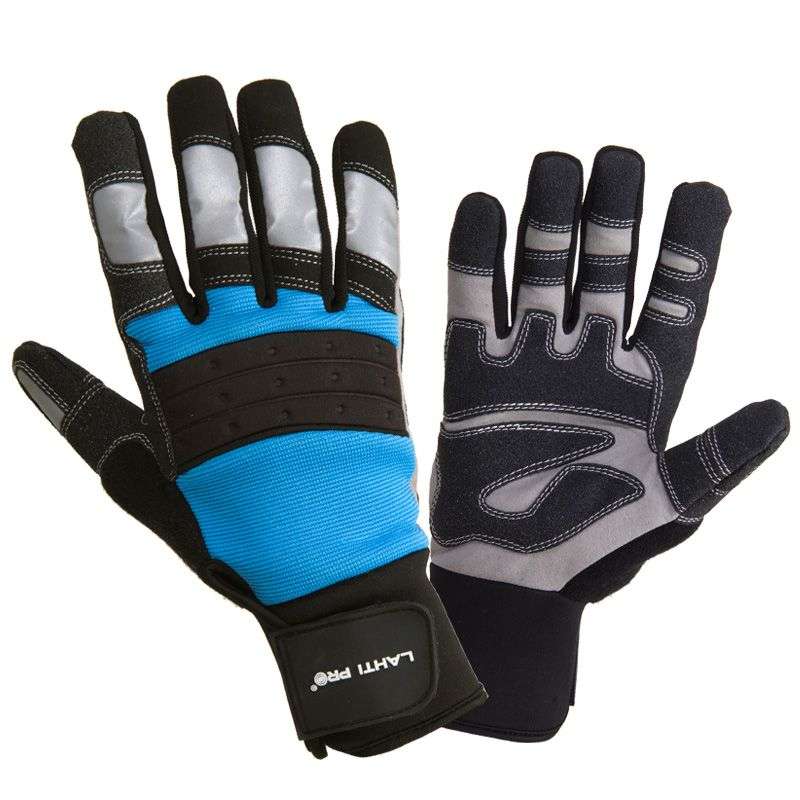 • Straturi elastice de elastan pe porţiunea dorsală a palmei pentru asigurarea unei potriviri perfecte. Numeroase întărituri din PVC pentru asigurarea unei rezistenţe ridicate la abraziune pe porţiunea palmei, pe porţiunea degetelor, din care intensificat pe porţiunea degetului mare. Componente reflectorizante pentru o siguranţă ridicată în cadrul utilizării. Textură specială pe porţiunea laterală a degetului mare pentru asigurarea posibilităţii ştergerii transpiraţiei. Manșetă reglabilă cu arici, model cu manşete lungi. Destinat utilizării în ateliere, depozite, construcţii, transport, sport, recreaţie.