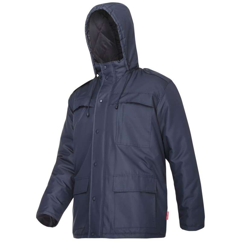 • Material impermeabil din ţesătură cu înveliş poliuretan. 7 buzunare (6 externe, din care 1 cu închidere prin fermoar și 1 intern). Glugă căptuşită detaşabilă prin fermoar, cu şnur pentru ajustare. Fermoar acoperit cu o fâşie suplimentară cu capse pentru închidere. Manşete interioare elastice.